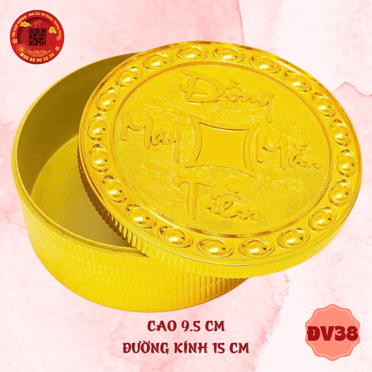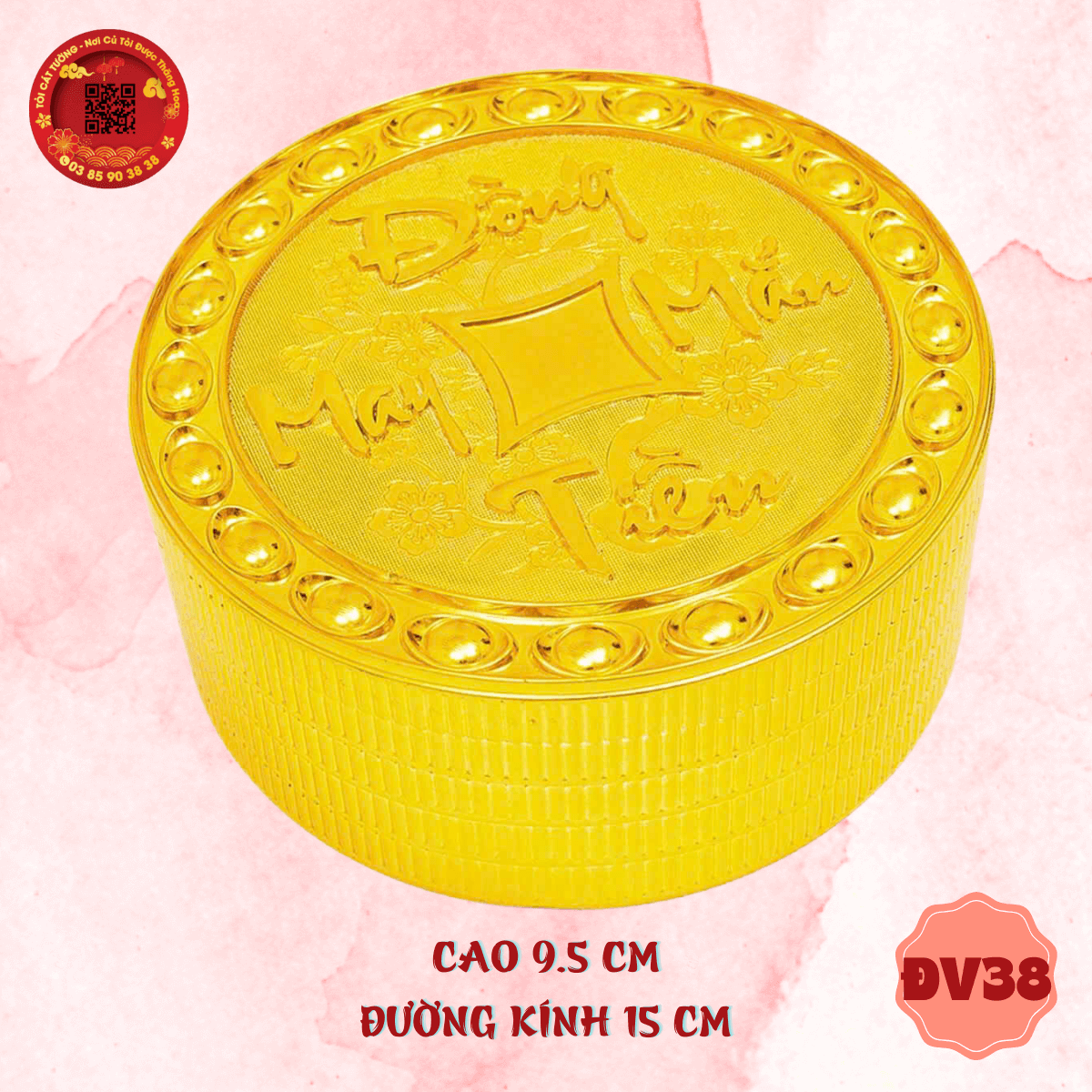 - Hộp tròn vàng lớn đồng tiền may mắn chân đế chữ phúc độc đáo ở thiết kế giúp bạn tha hồ trang trí nhà cửa, bếp núc, bàn thờ, phòng ngủ, phòng học, tháp tỏi thần tài, oản, tráp, giỏ quà,... thêm hoành tráng và đầy ý nghĩa