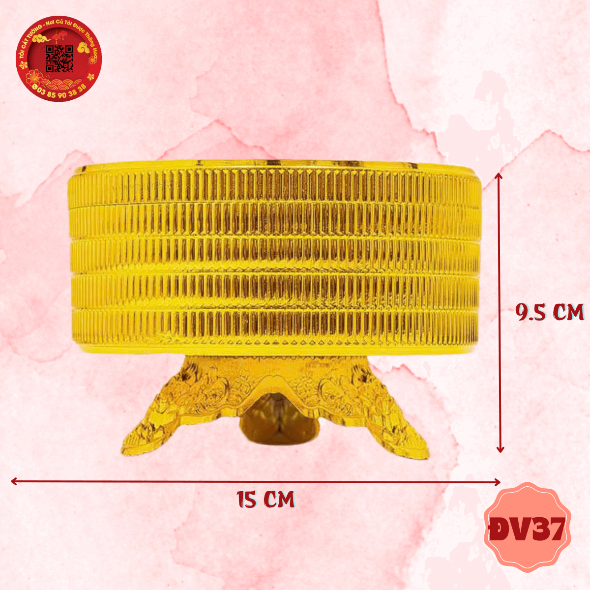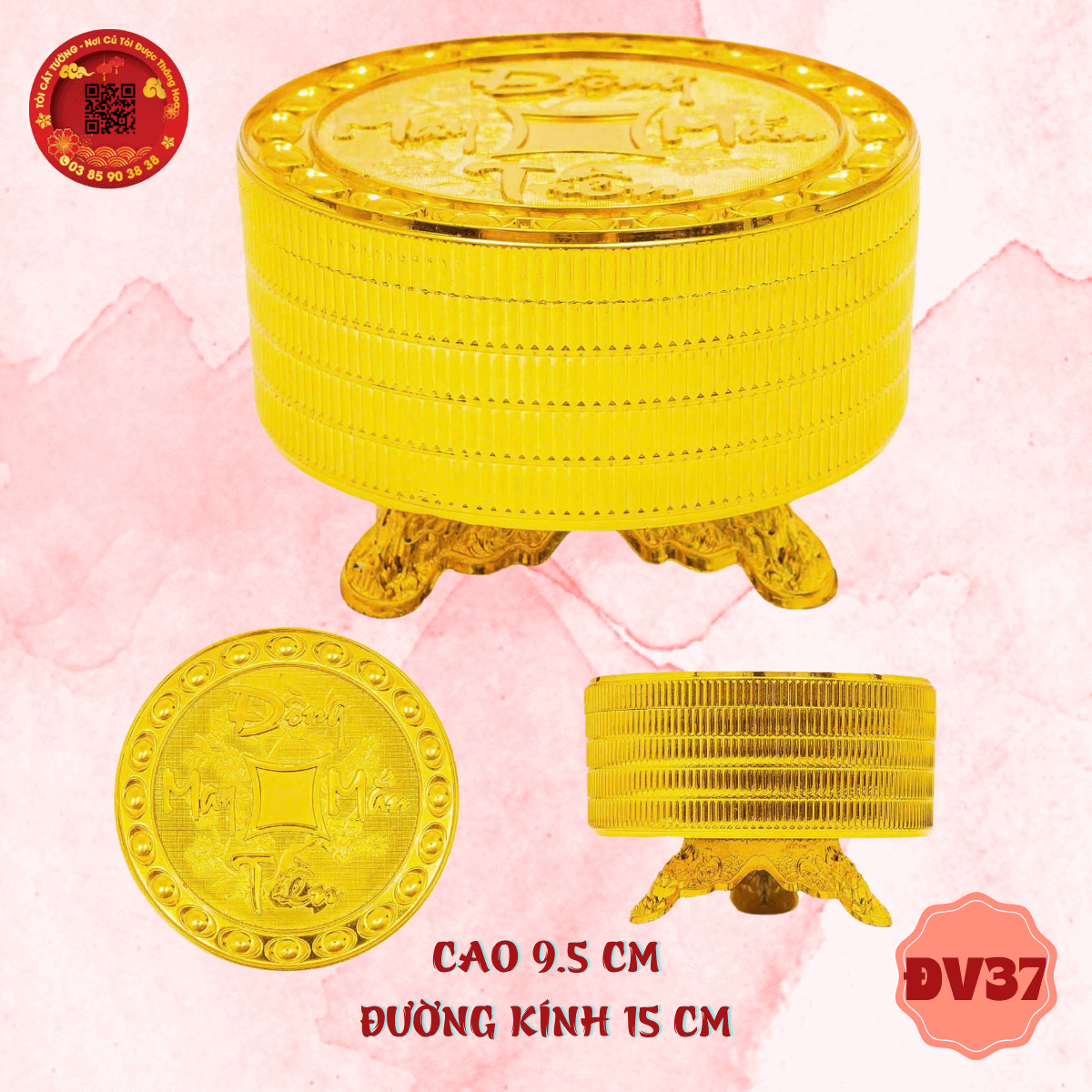 - Hộp tròn vàng lớn đồng tiền may mắn chân đế rồng độc đáo ở thiết kế giúp bạn tha hồ trang trí nhà cửa, bếp núc, bàn thờ, phòng ngủ, phòng học, tháp tỏi thần tài, oản, tráp, giỏ quà,... thêm hoành tráng và đầy ý nghĩa