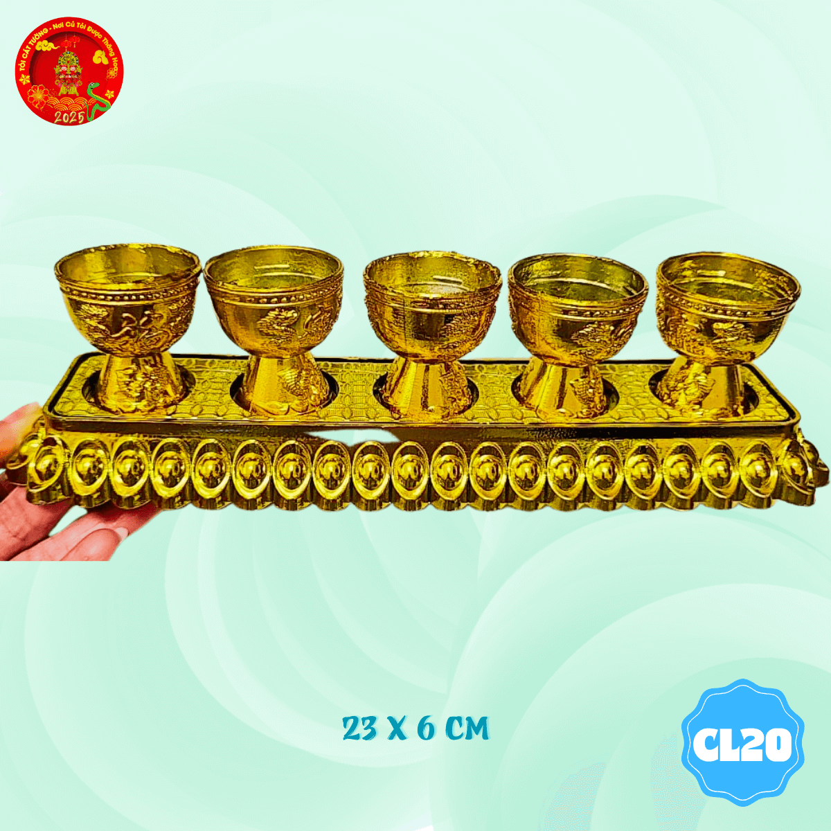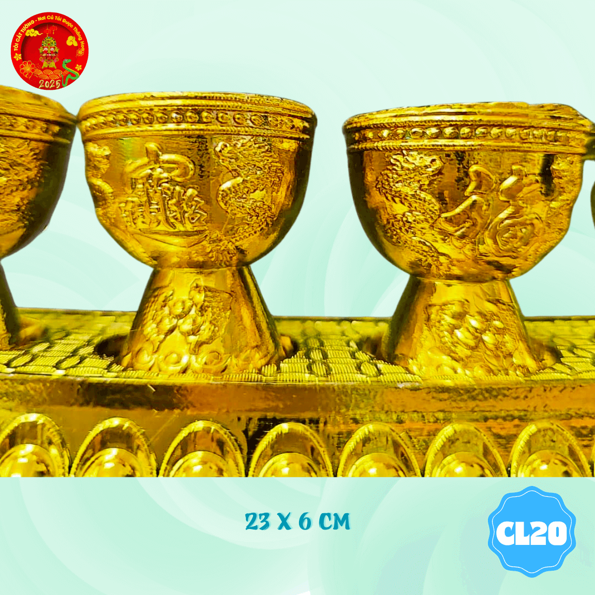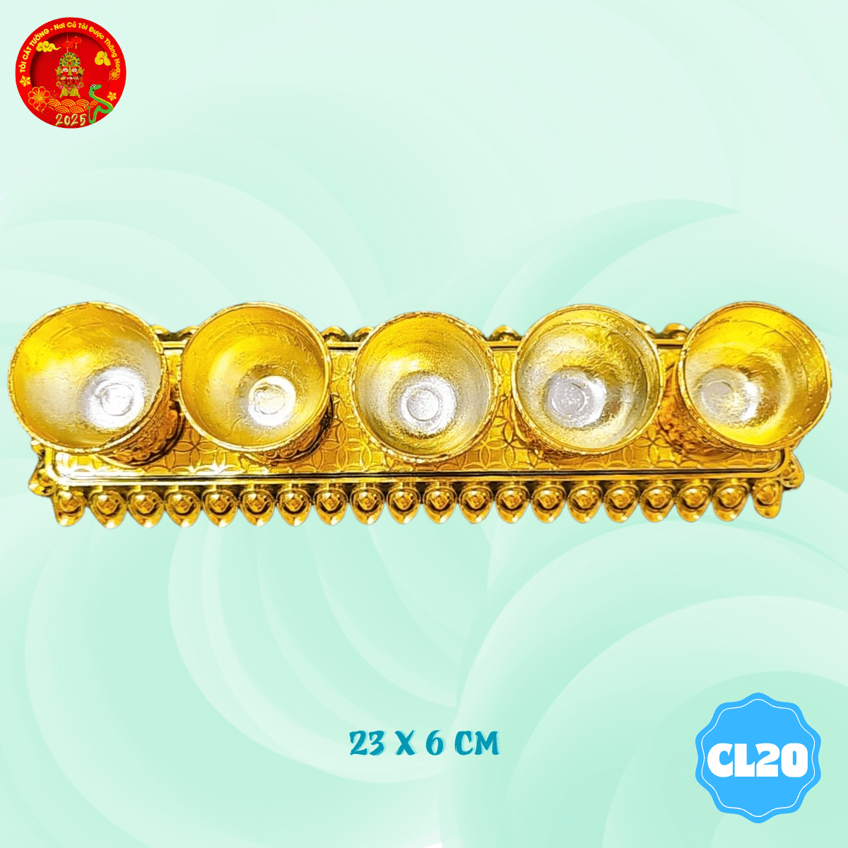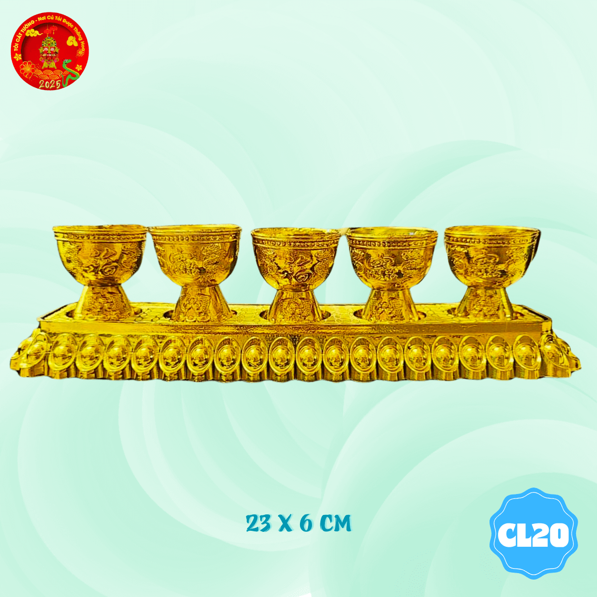- Vỉ 5 chung ly thỏi vàng thờ cúng có thiết kế chỉnh chu từng chi tiết giúp bàn thờ thêm lộng lẫy và trang nghiêm
