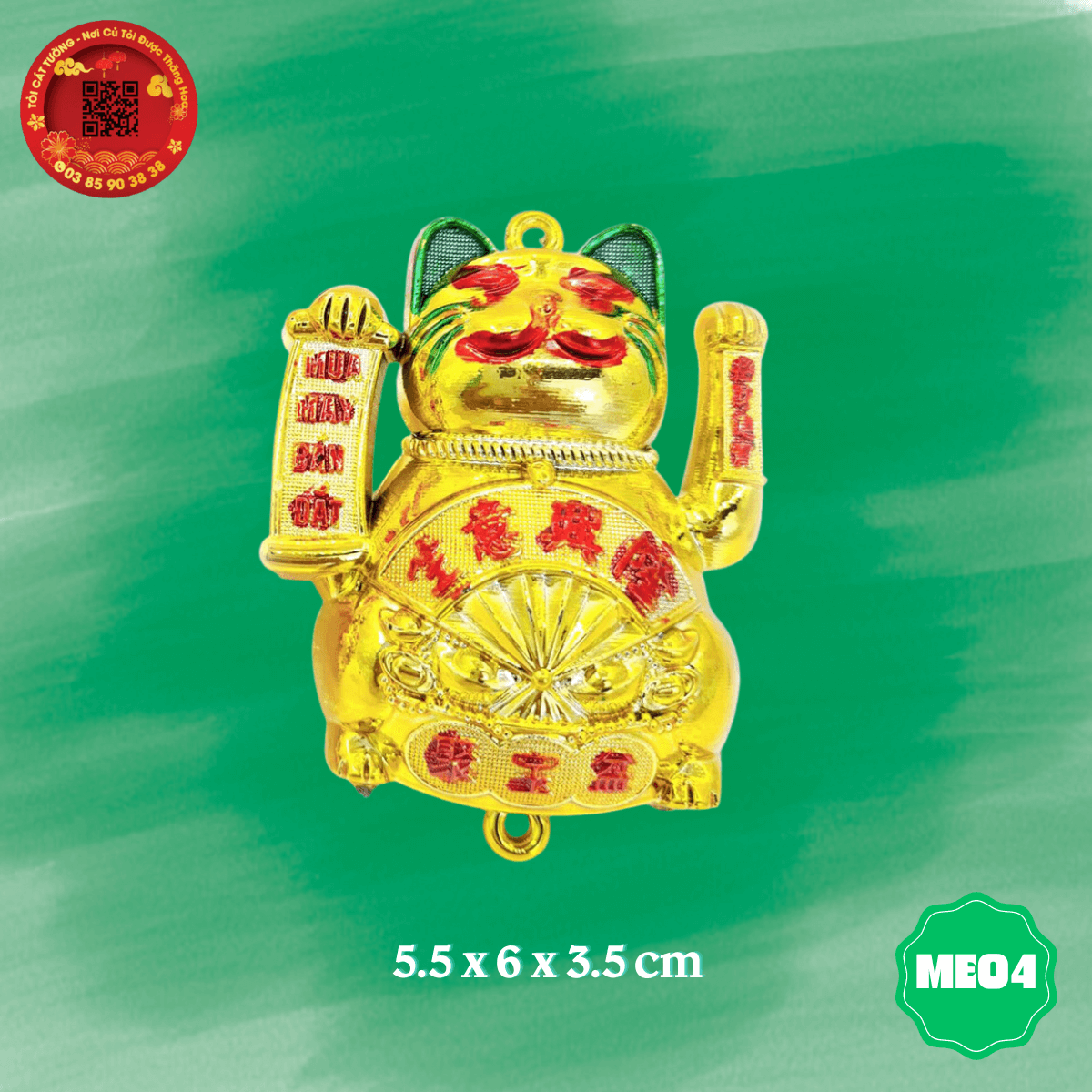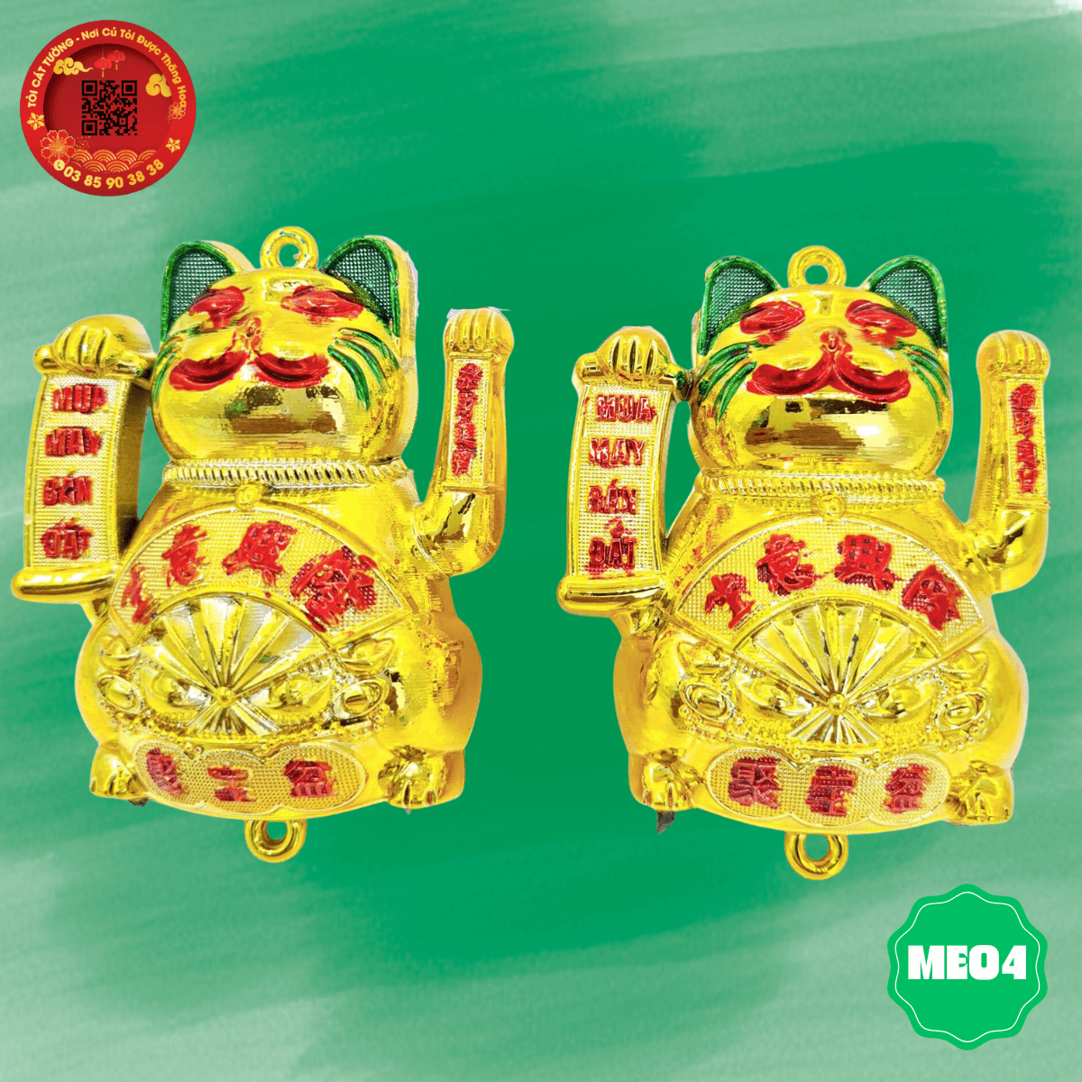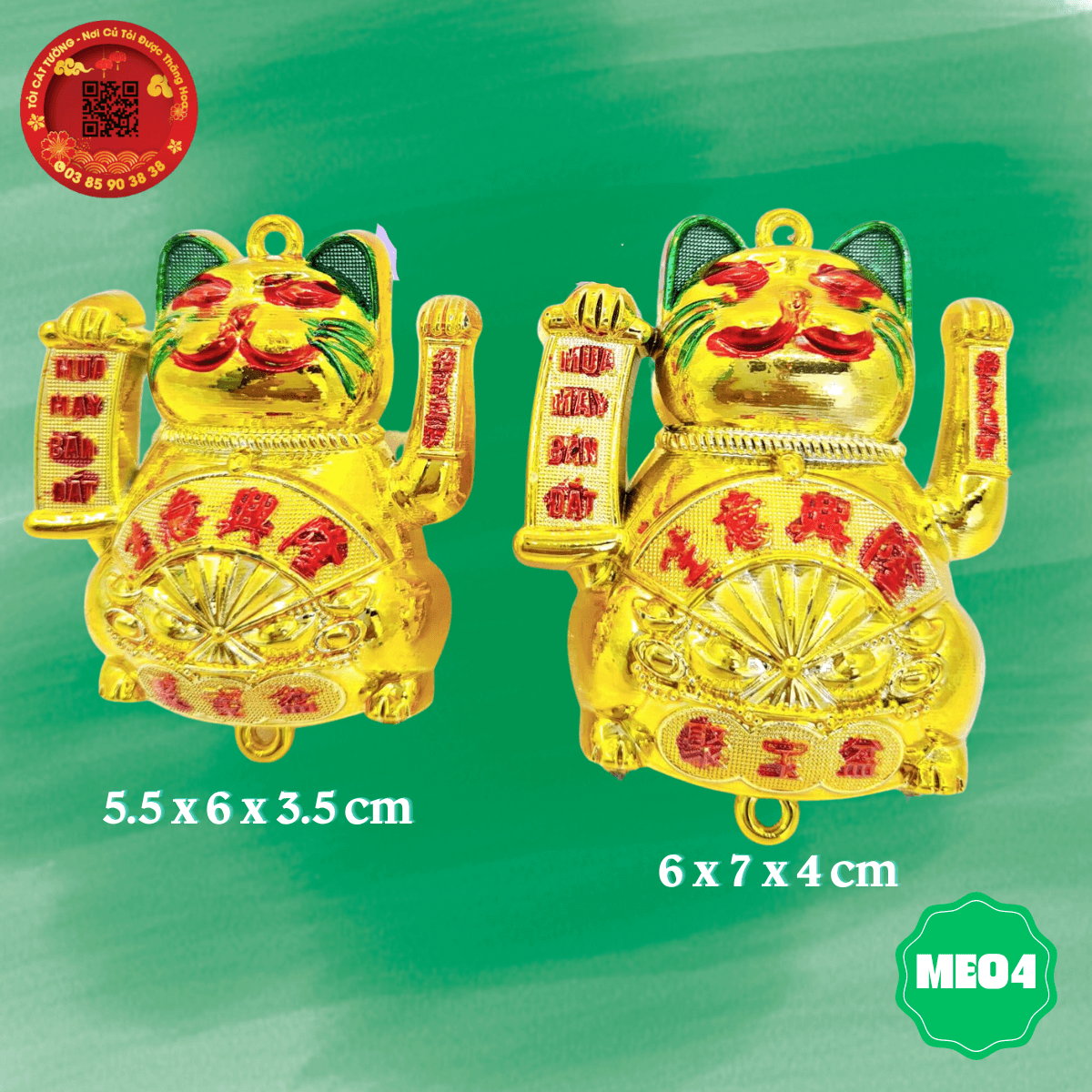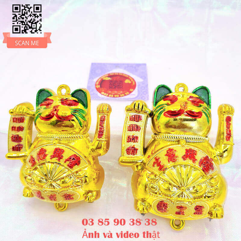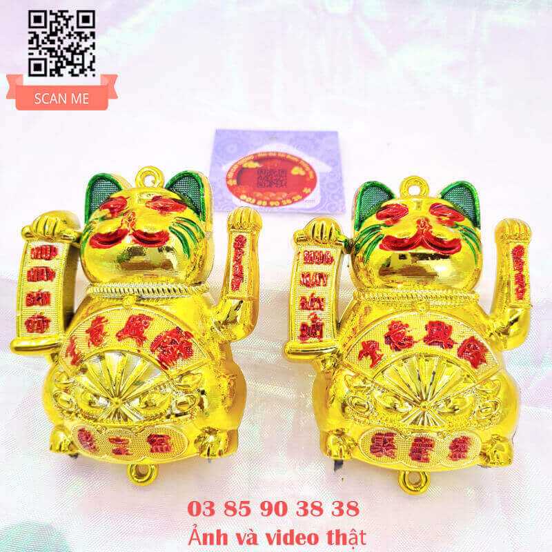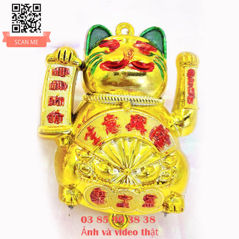 - Con mèo mua may bán đắt với thiết kế độc đáo, một tay cầm liễng mua may bán đắt, một tay chiêu tài gọi lộc, trên bụng còn có chiếc quạt thần thánh hưng vượng cho gia chủ