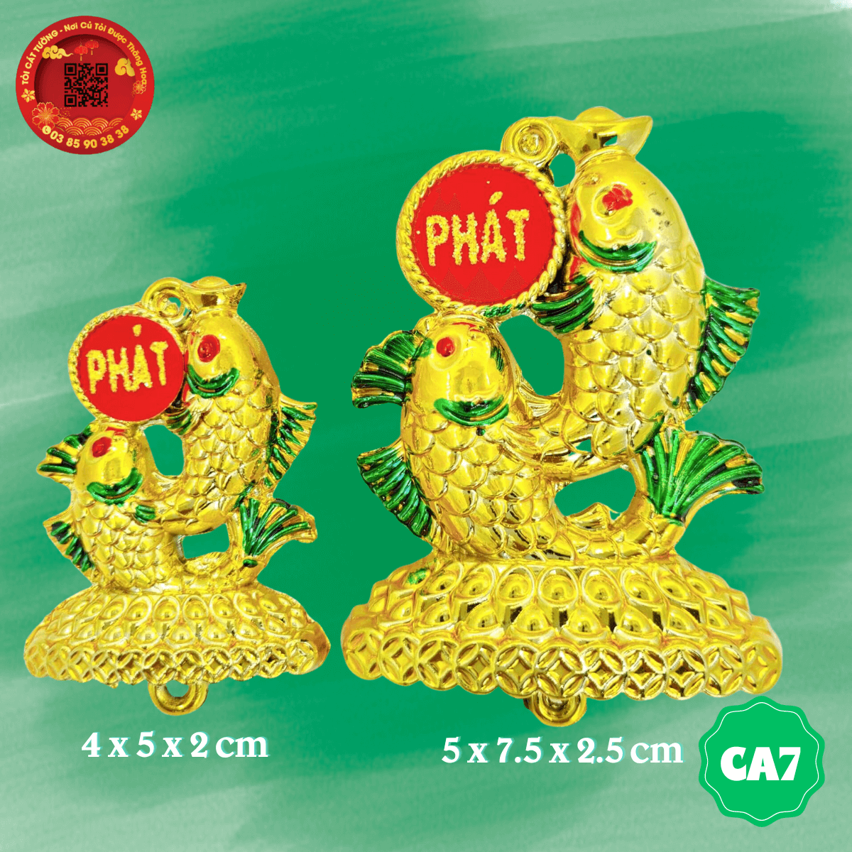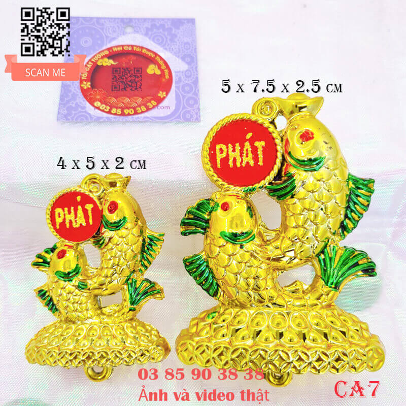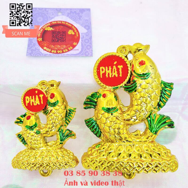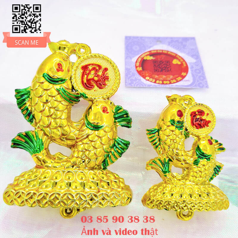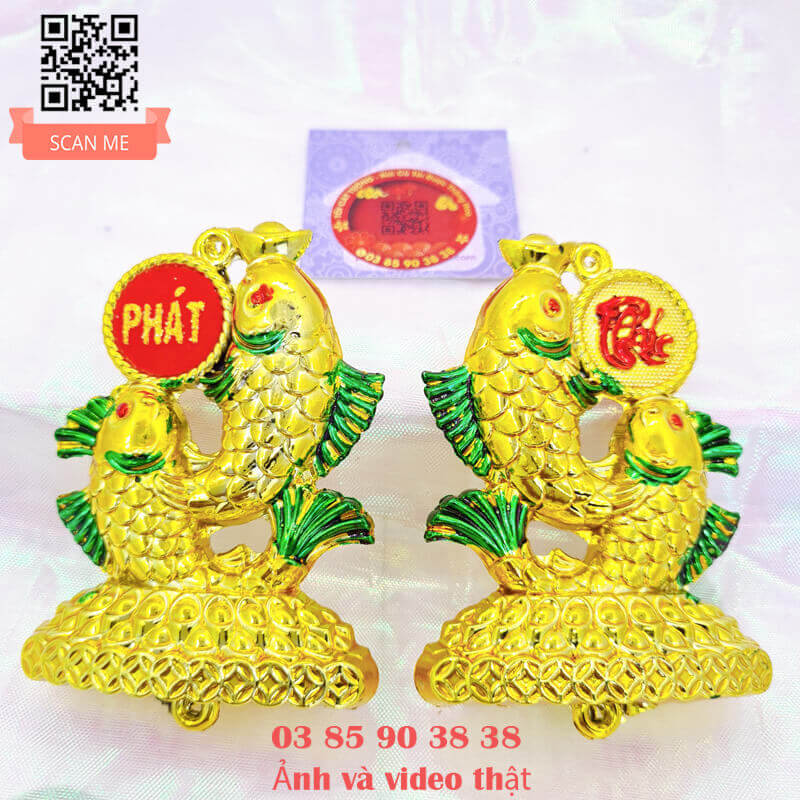 - Hai con cá phát lộc thiết kế bởi đôi cá quấn lấy nhau siêu đẹp nằm trên núi tiền vàng, một con ngậm thỏi vàng phúc tài, một con ngậm đồng tiền phát lộc