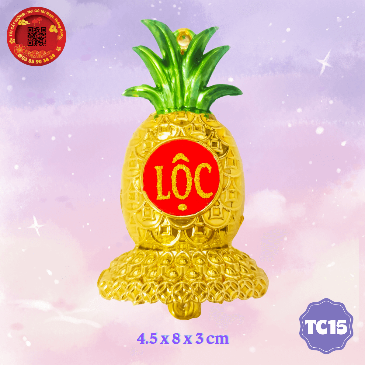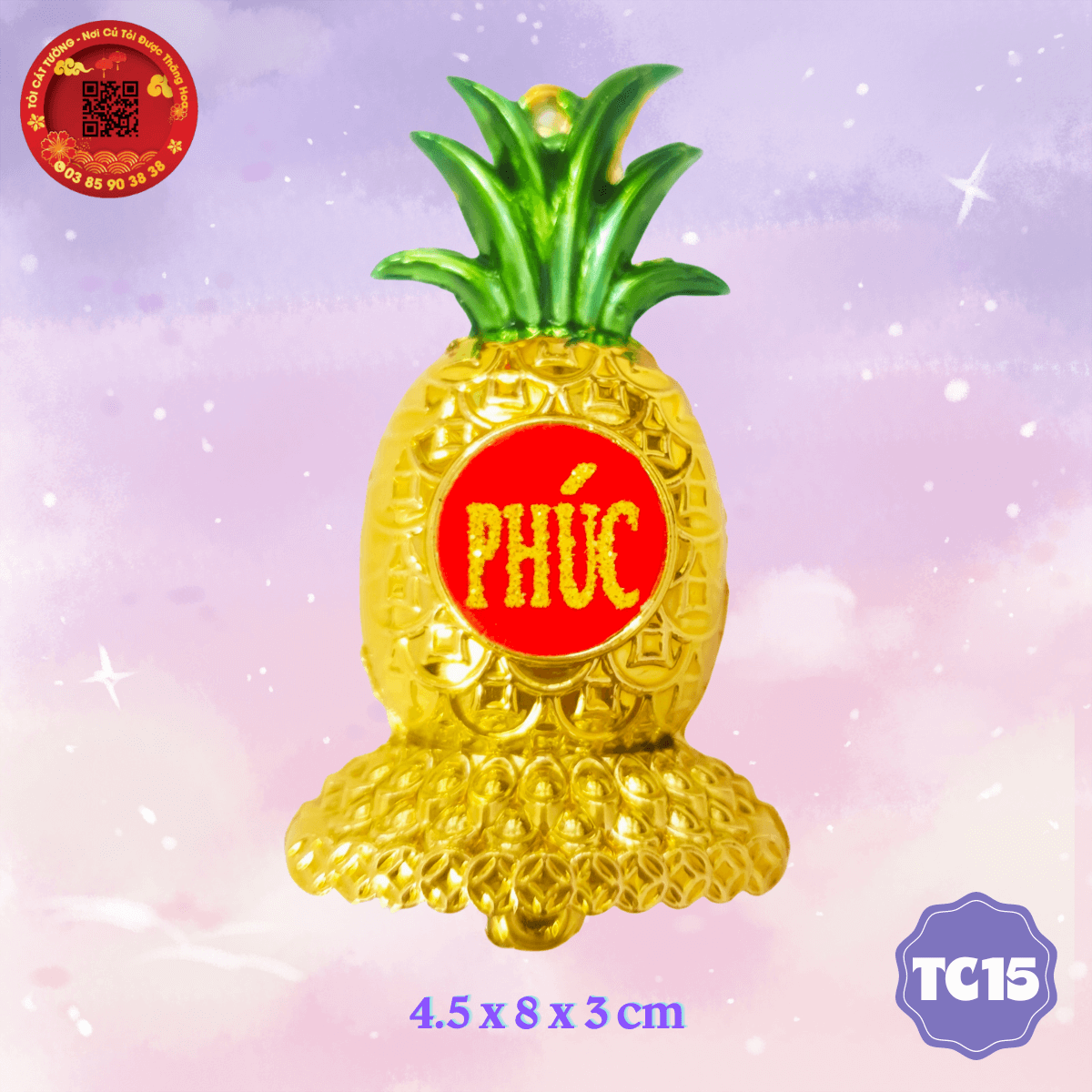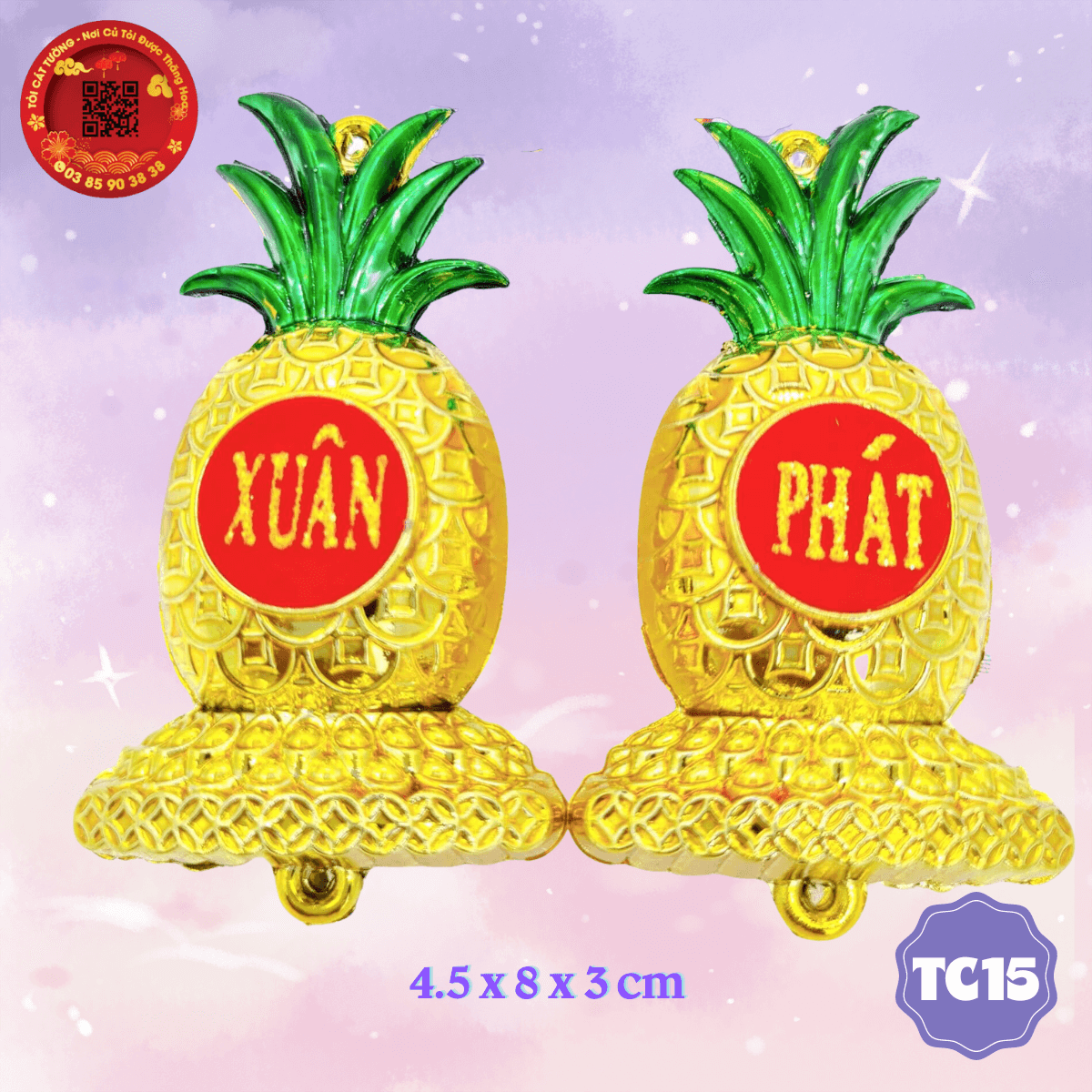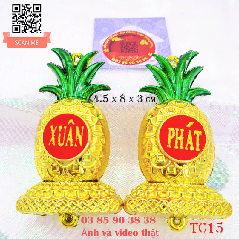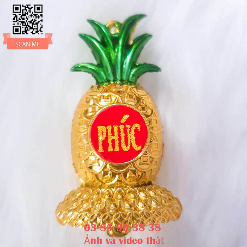 - Trái thơm khóm phúc lộc được thiết kế cực đẹp và tinh xảo từng chi tiết, dán chữ "phúc, lộc, xuân, phát,.." nhũ kim tuyến vàng rực rỡ trên nền đỏ nhung sang trọng