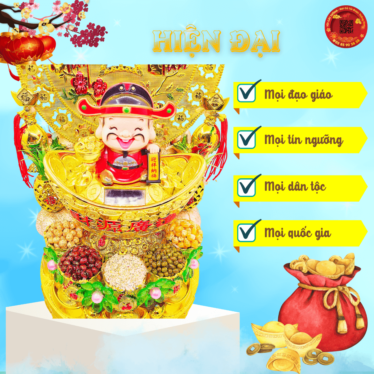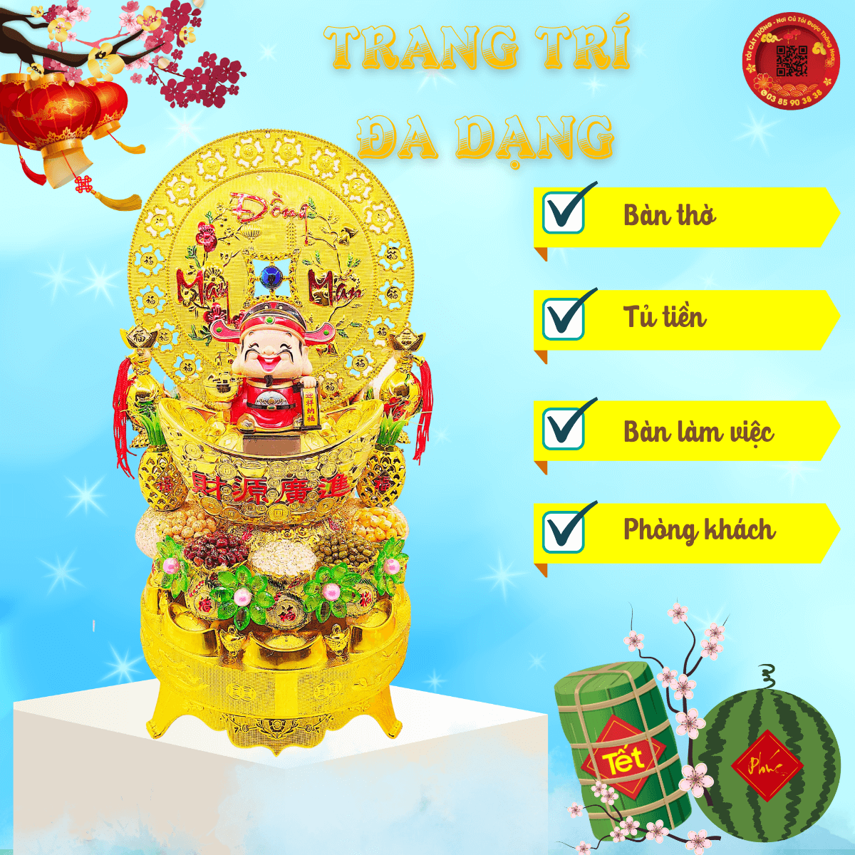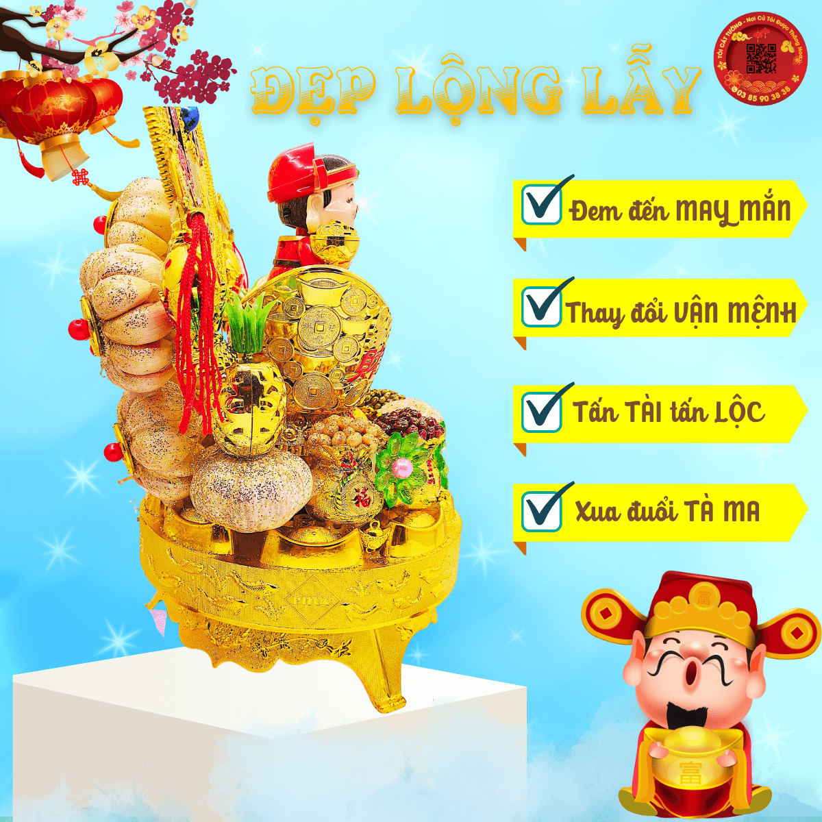 - Miệng ông thần tài cười toe toét phúc hậu gật đầu liên tục, hai tay cầm vàng và liễng tài lộc nâng lên xuống sẽ giúp gia chủ phát tài, phát lộc và hoan hỉ