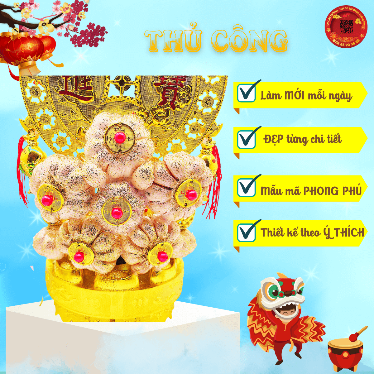 - Sử dụng đúng 9 củ tỏi tròn trịa nhất, đẹp đẽ nhất lấy đúng chữ "cửu" trong tiếng Hán đem đến y nghĩa viên mãn, trường tồn theo thời gian cho gia chủ