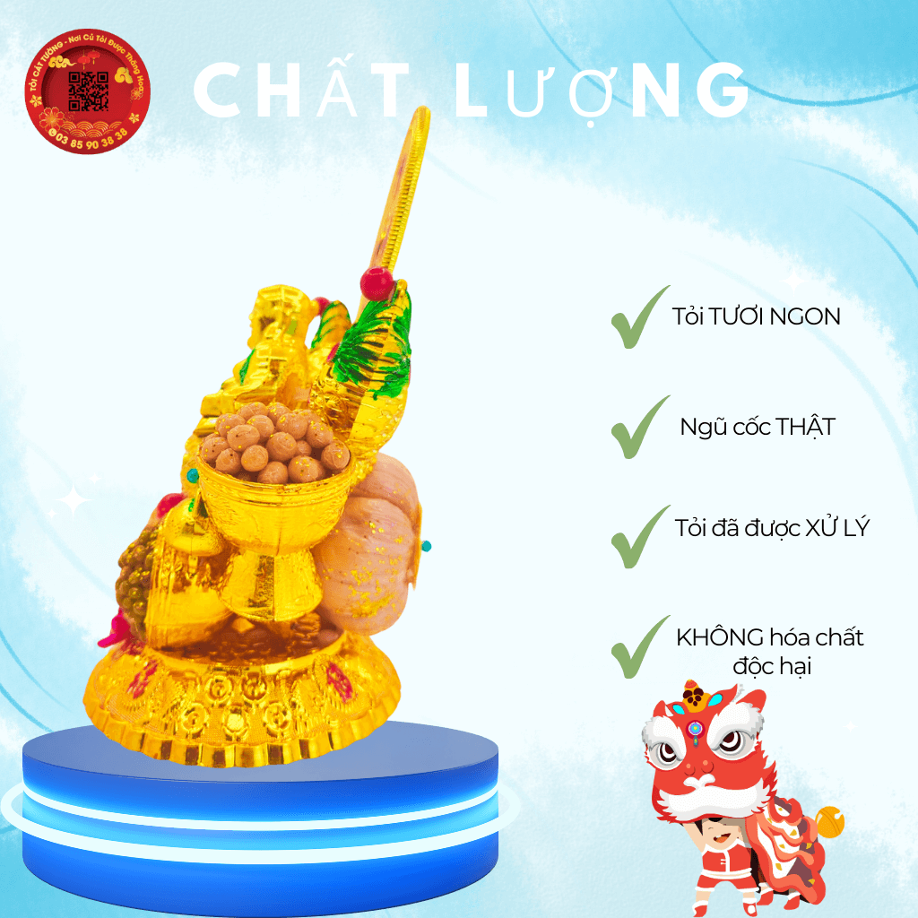 Bông tỏi ông địa được làm từ những nguyên liệu vàng tươi sáng sắp xếp sáng tạo tinh tế kết hợp ngũ hạt.