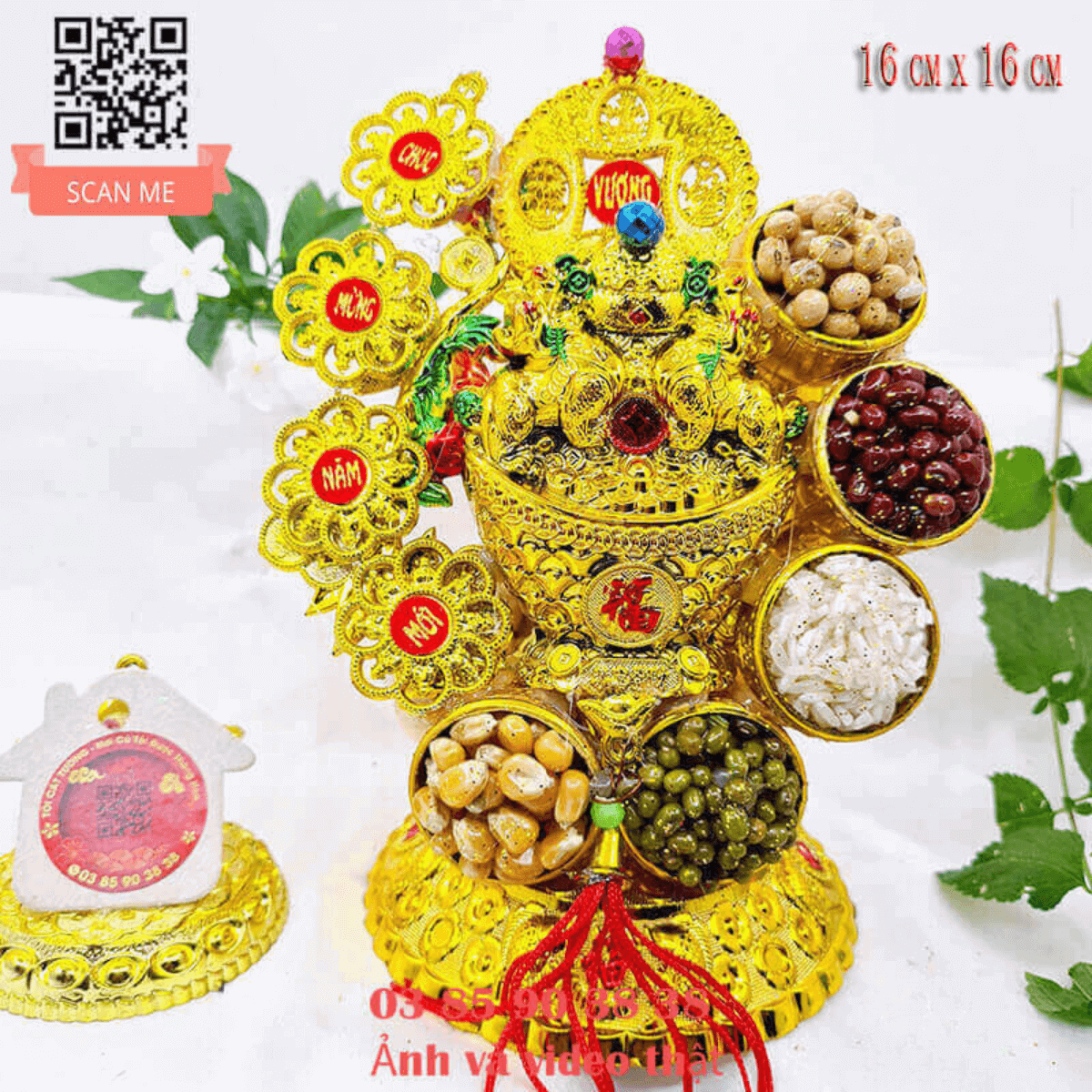 Mang màu vàng của hạt bắp - mệnh kim, màu xanh mượt của đậu xanh - mệnh mộc, màu trắng của hạt gạo - mệnh thủy, màu đỏ của hạt đậu đỏ - mệnh hỏa, màu nâu vàng của hạt đậu nành - mệnh thổ. Chúng tương sinh tương khắc nhau nhưng hòa quyện tuyệt vời với nhau nhằm trung hòa vận mệnh của gia chủ.