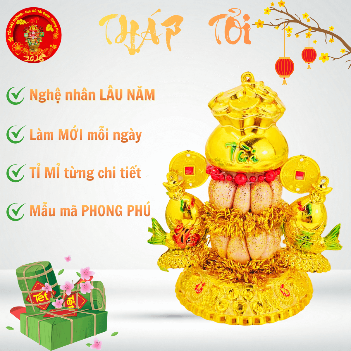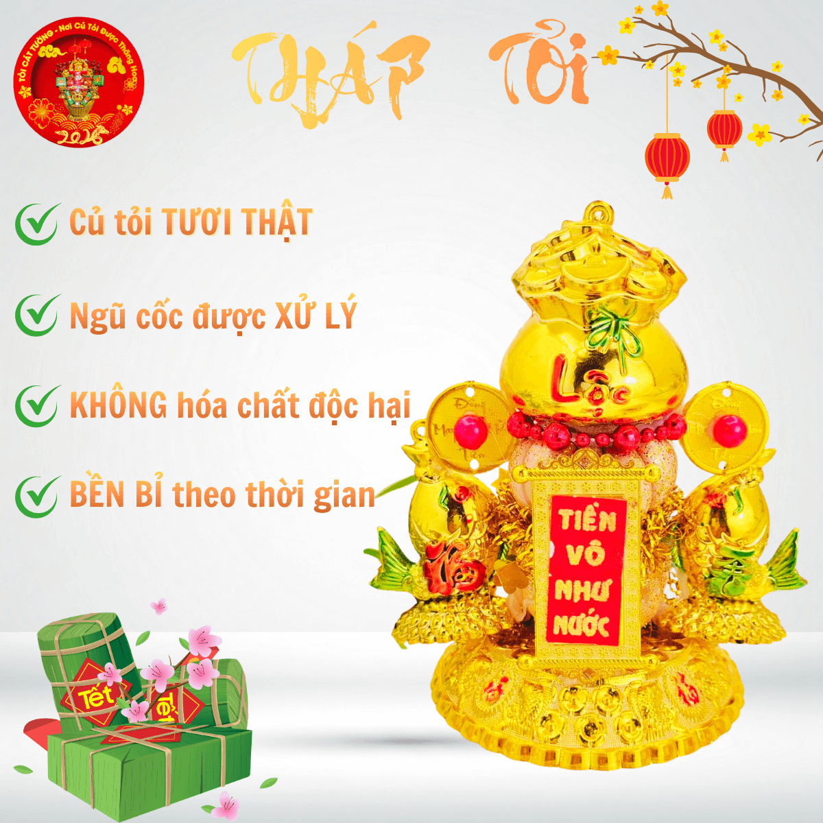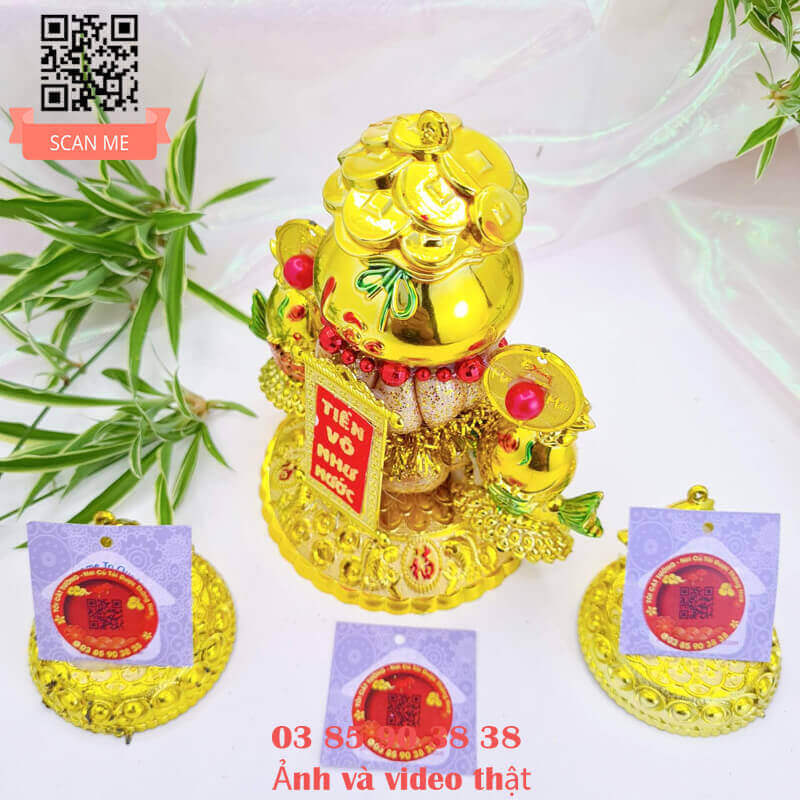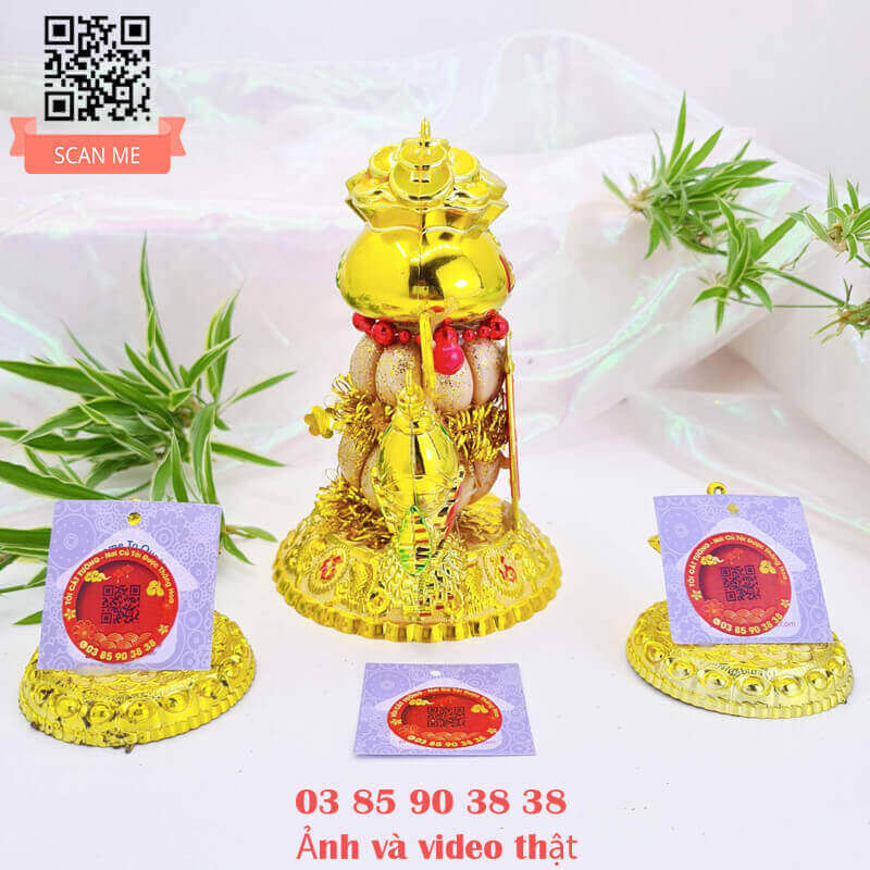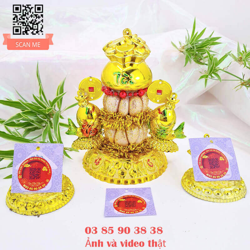 TỎI CÁT TƯỜNG hân hạnh mang đến Bông tỏi thần tài phát lộc có chiếc túi lớn chứa đầy đồng vàng, liễn đỏ nhũ " tiền vô như nước" hoặc "vàng vô đầy nhà", cặp cá song hỷ hưng thịnh rất ý nghĩa và đẹp hoàn hảo!