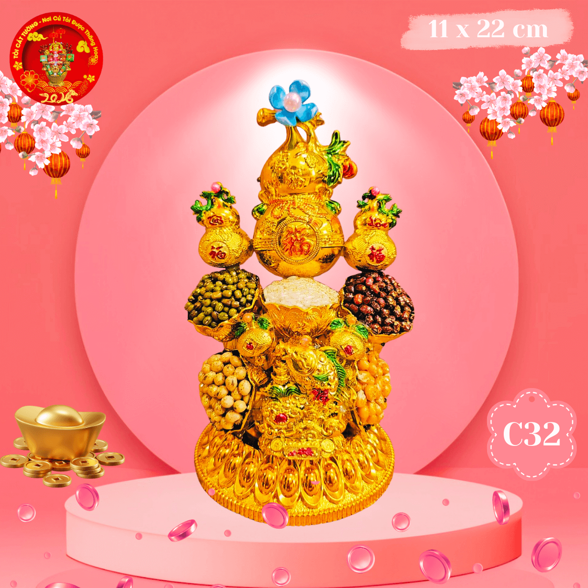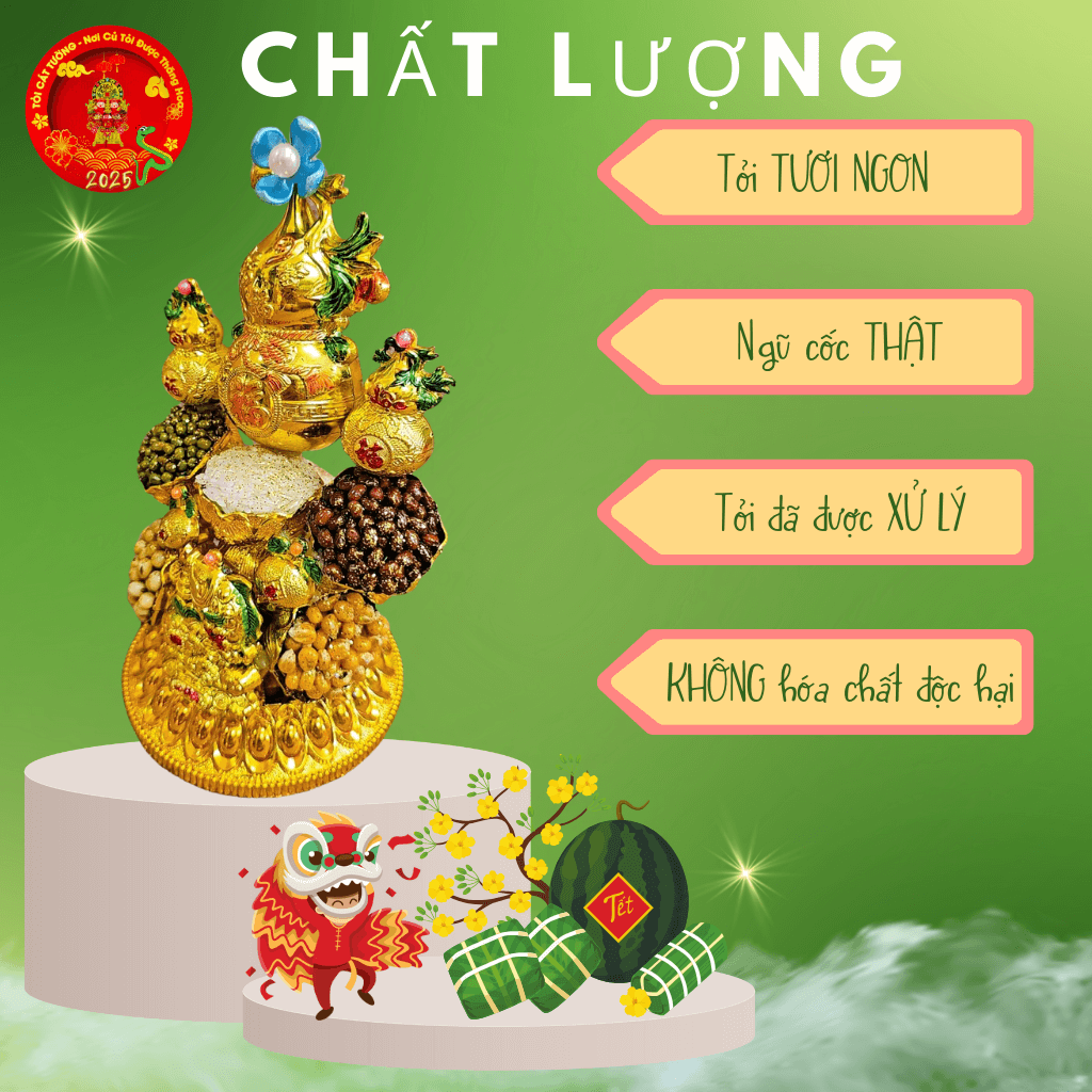 - Tháp Tỏi Ông Địa Tài Lộc Hồ Lô được làm từ những nguyên liệu vàng tươi sáng sắp xếp sáng tạo tinh tế kết hợp ngũ hạt.