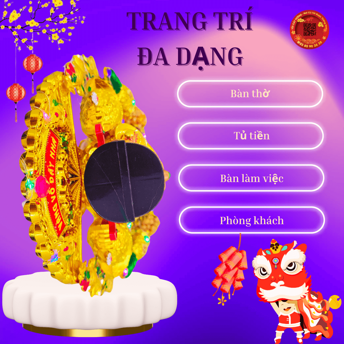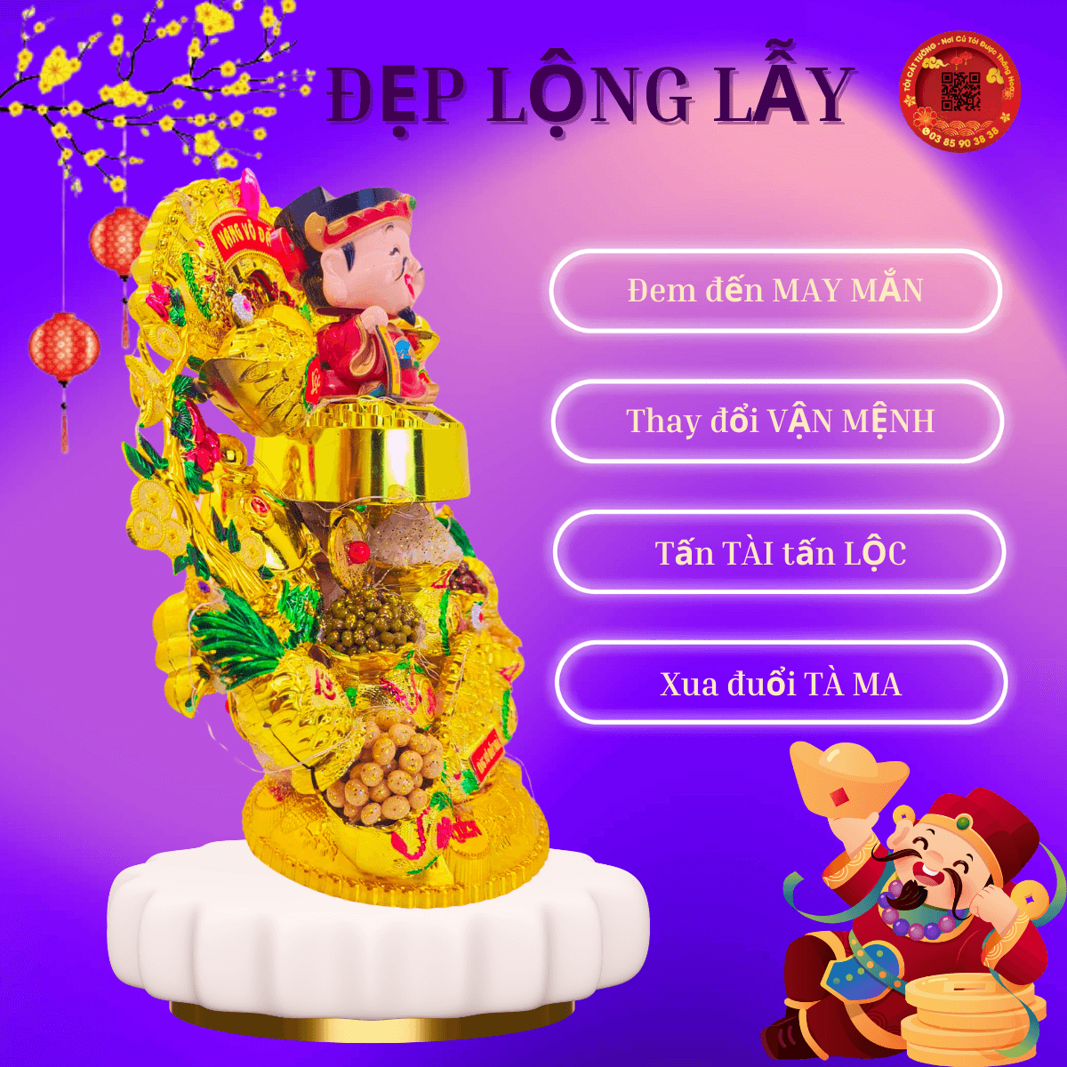 - Miệng ông thần tài cười toe toét phúc hậu gật đầu liên tục, hai tay cầm vàng và liễng tài lộc nâng lên xuống sẽ giúp gia chủ phát tài, phát lộc và hoan hỉ