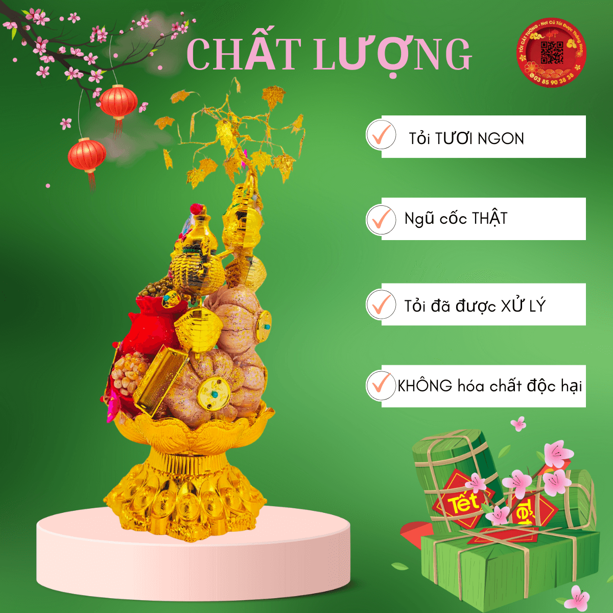- Tháp tỏi ngọc thực làm từ những củ tỏi thật tươi được chọn lựa từng tép tỏi và được xử lý kỹ lưỡng giúp trưng bày trong thời gian dài