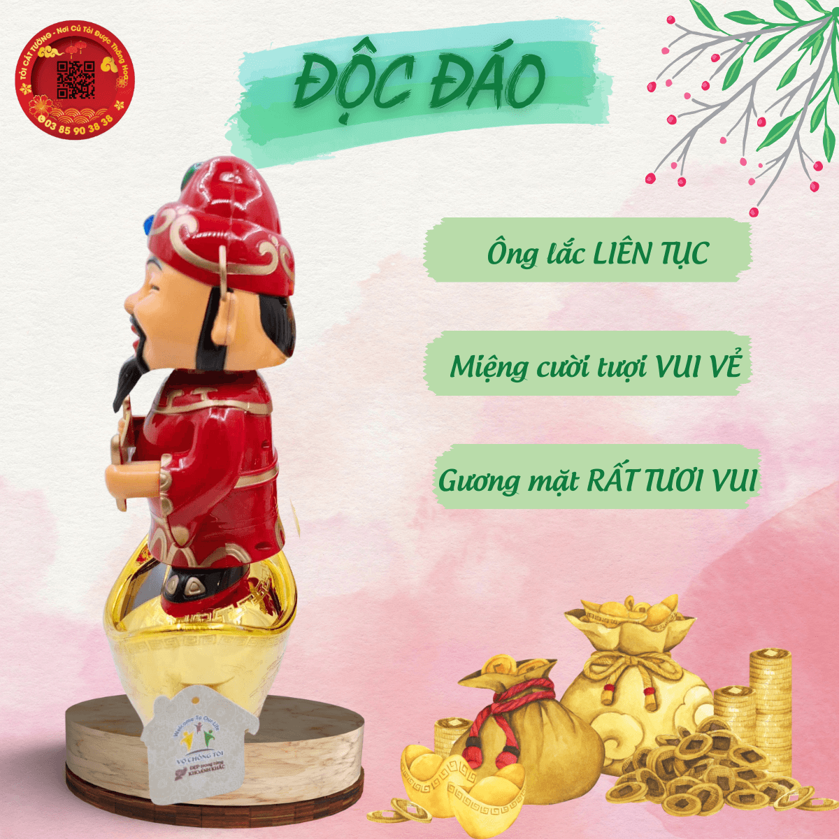 Tượng Thần Tài sử dụng năng lượng mặt trờichỉ cần đặt tượng ở nơi đầy đủ ánh sáng thì tượng gật đầu liên tục đem lại sự may mắn cho bạn! Thích hợp trang trí mọi không gian văn phòng, cửa hàng, bàn học, xe ô tô,...