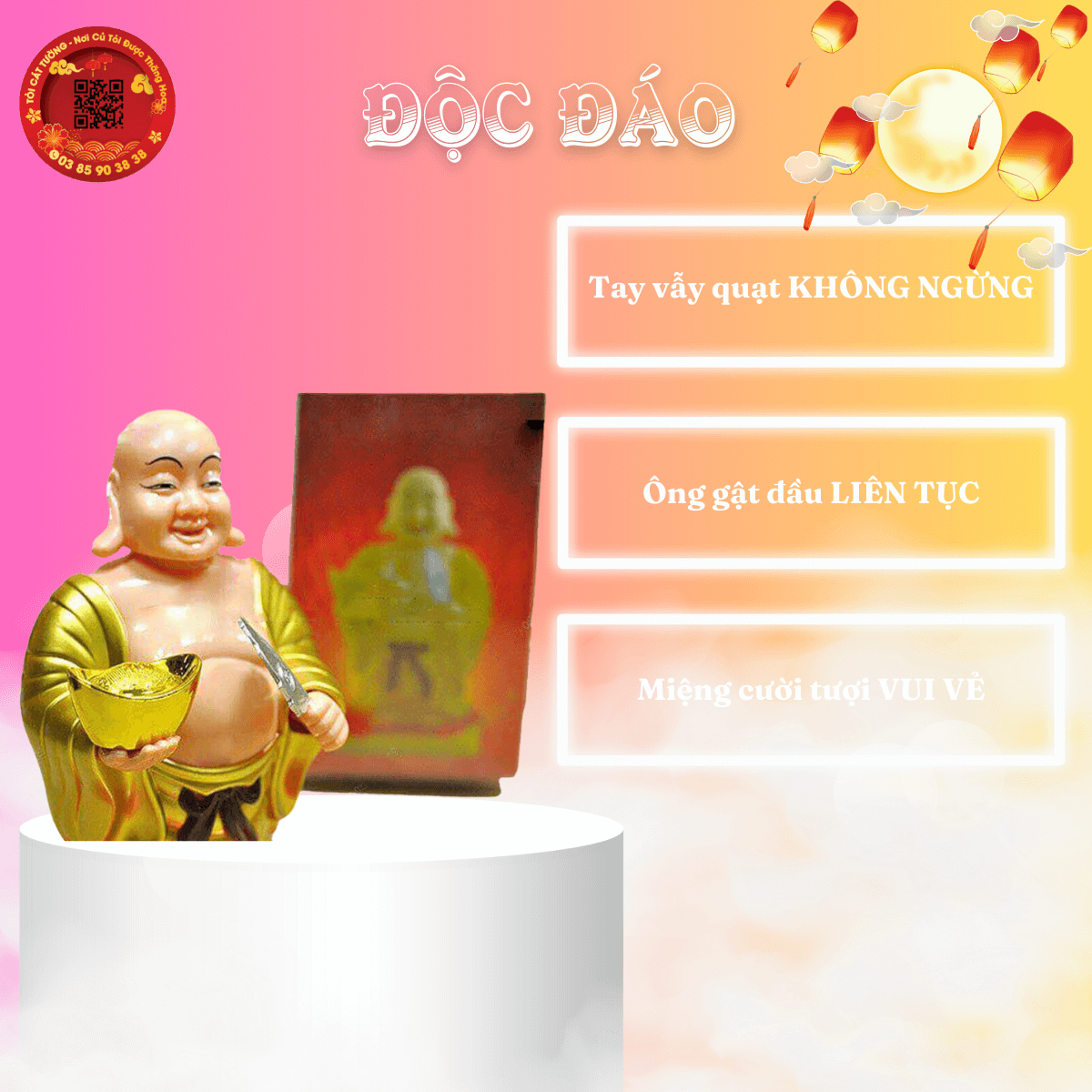 _ Di Lặc gật đầu liên tục và tay không ngừng vẫy quạt sẽ giúp gia chủ phát tài, phát lộc và nhiều điều hoan hỉ trong cuộc sống.